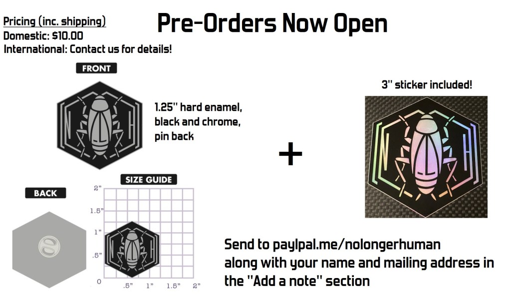 Each pre-order will also include a free 3″ holographic new nolongerhuman sticker as well!