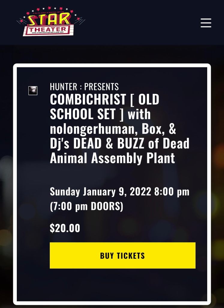 Posted on December 24, 2021May 14, 2022 by nolongerhumanofficialFirst Show of 2022 Just Announced! Facebook Event Page: https://www.facebook.com/events/437880288051770/ Tickets: https://www.ticketweb.com/event/combichrist-old-school-set-star-theater-tickets/11659055?REFERRAL_ID=twfb Stop. Listen. Think. Infest. Click to share on Facebook (Opens in new window) Facebook Click to share on Reddit (Opens in new window) Reddit Click to share on X (Opens in new window) X Click to share on LinkedIn (Opens in new window) LinkedIn More Click to share on Tumblr (Opens in new window) Tumblr Click to share on Pinterest (Opens in new window) Pinterest Click to share on Telegram (Opens in new window) Telegram Click to share on WhatsApp (Opens in new window) WhatsApp Click to share on Pocket (Opens in new window) Pocket Click to email a link to a friend (Opens in new window) Email Click to print (Opens in new window) Print Like Loading... Related