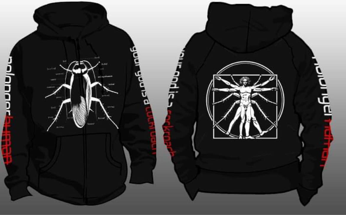 These zip-up hoodies feature an anatomical cockroach on the front, a re-imagined Vitruvian Man with puppet and insect parts on the back, “nolongerhuman” on the right sleeve, and “your god is a cockroach” on the left sleeve.