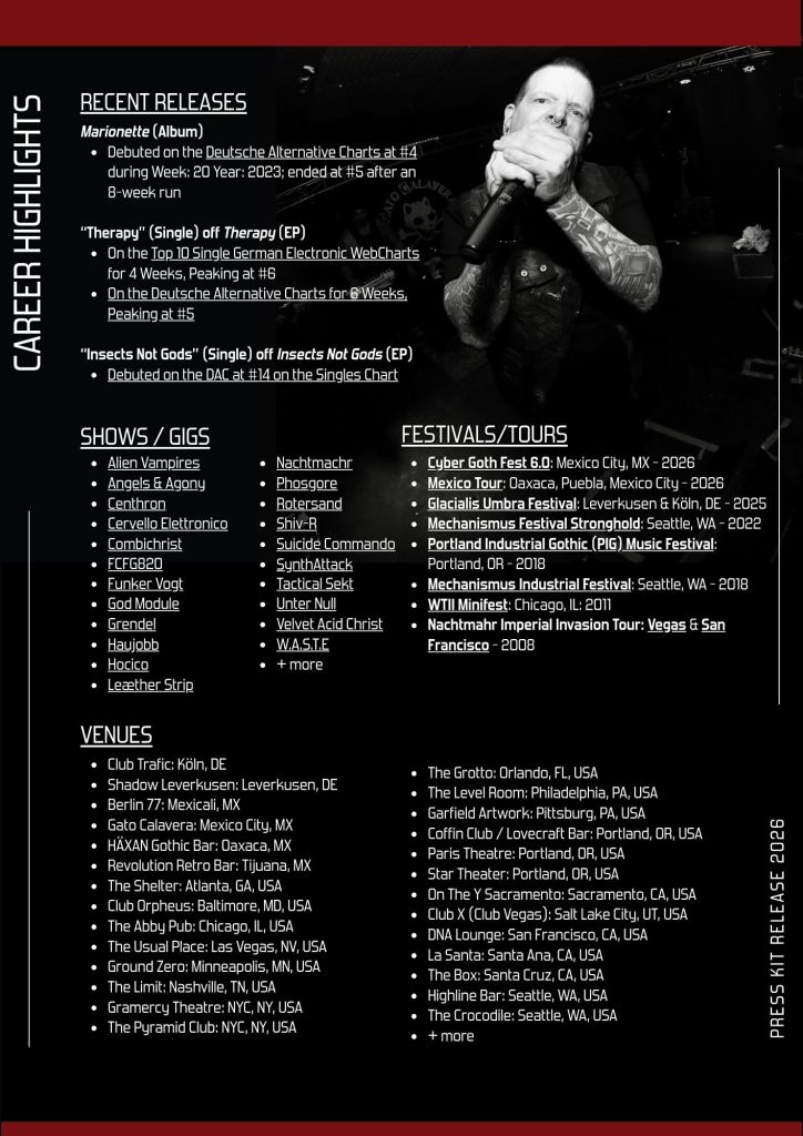 Festival / Tours: Cyber Goth Fest 6.0 (MX), Glacialis Umbra (DE), Mechanismus Industrial Festival (Seattle), PIG Fest (Portland), WWII Minifest (Chicago), Nachtmahr Imperial Invasion Tour (PDX, San Francisco, Vegas)