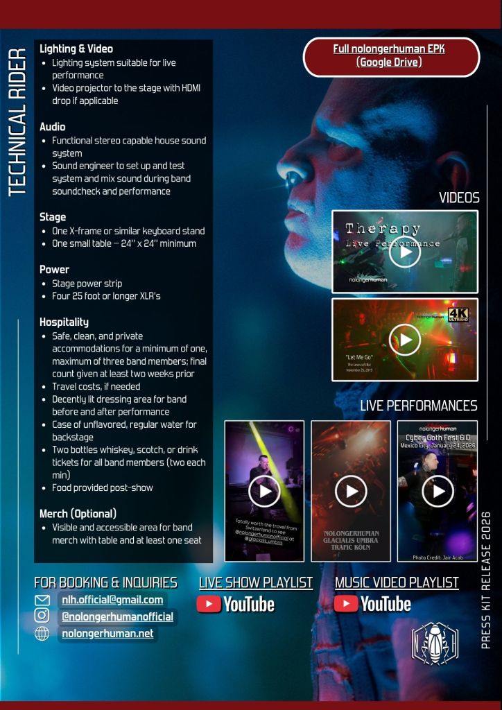 Delivering a commanding stage presence and relentless live energy, nolongerhuman delivers an intense and immersive experience built for late-night stages, outdoor festival grounds, and underground club events across both the U.S. and international dark music scenes.