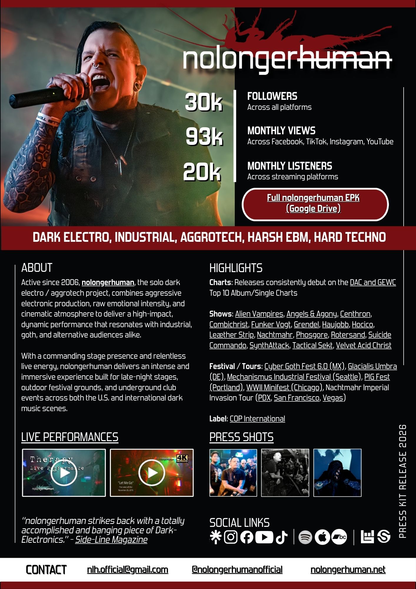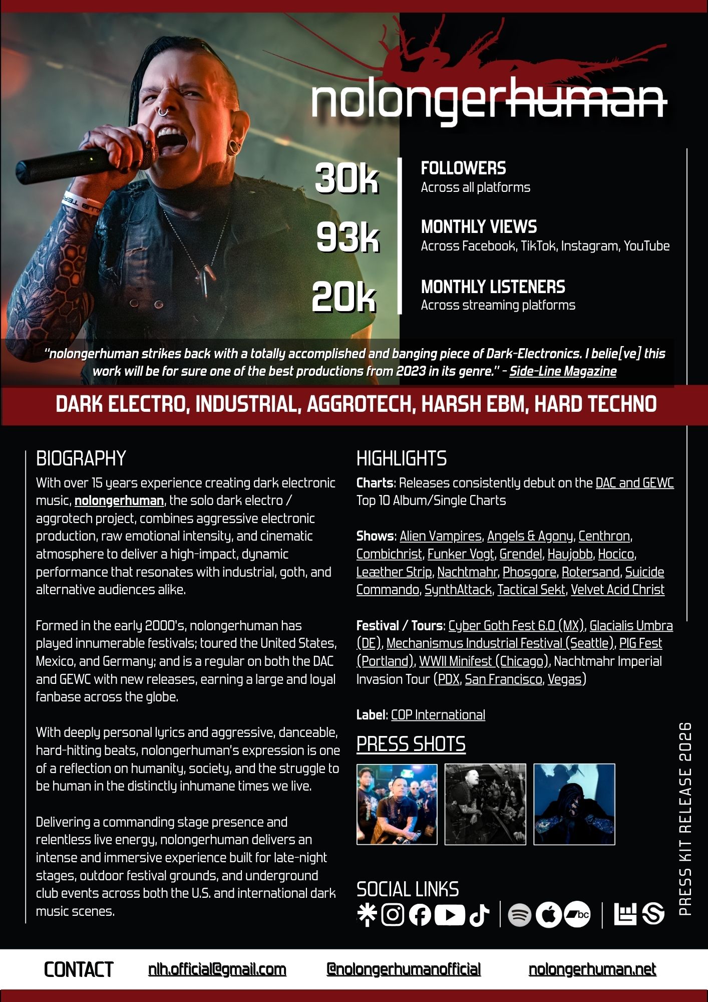 Delivering a commanding stage presence and relentless live energy, nolongerhuman delivers an intense and immersive experience built for late-night stages, outdoor festival grounds, and underground club events across both the U.S. and international dark music scenes.