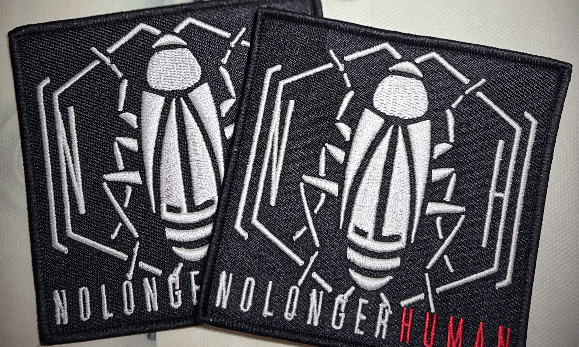Now available exclusively on Bandcamp, these embroidered (weaved) 3.5" square patches have a black merrowed border with the nolongerhuman logo in white and red stitching.